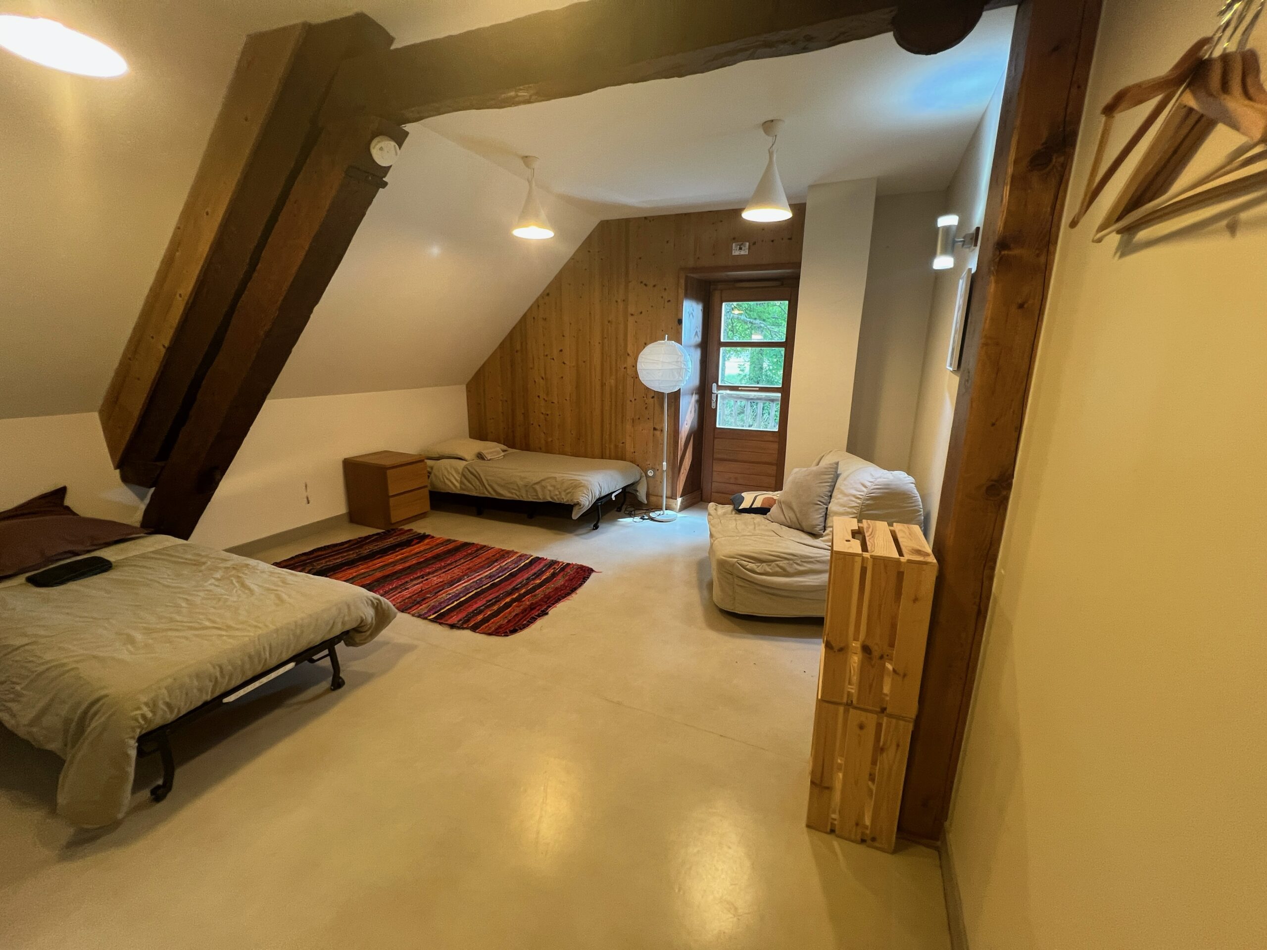 🛏️ 6 chambres confortables (lit double, lits simples ou triples selon la configuration), 🍴 Cuisine semi-professionnelle équipée, 🪵 Grande salle à manger chaleureuse avec poêle à bois (35 couverts), 🌌 Immersion totale dans la nature, sans voisin à moins de 8 km. 🌿 Capacité : jusqu’à 17 personnes – literie fournie, serviettes sur demande.